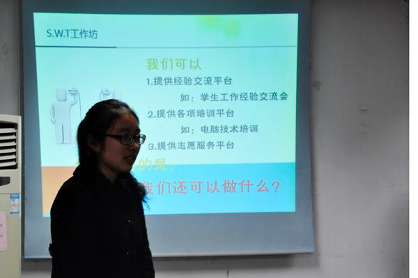 12月9日,我院第十二期S.W.T.工作坊在将军路校区学生事务服务中心楼上301会议室举行。院团委、学生会、科学与技术协会、青年志愿者协会的代表及各年级中心组组长等参与了活动。