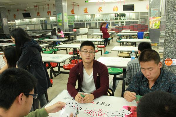 5月9日晚,备受欢迎的掼蛋挑战赛在明故宫校区一食堂一楼如期举行。16个班级共选派32名选手代表班级参加。现场有许多为参赛选手加油的观众,好奇于“掼蛋之星”花落谁家的同时,也学会了掼蛋这门“技艺”。赛程紧张激烈,直至当晚11点决赛才结束,104班孙宇和秦雅同学组成的代表队赢到了最后。