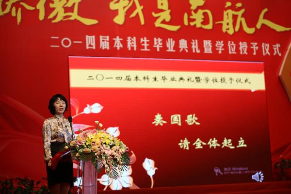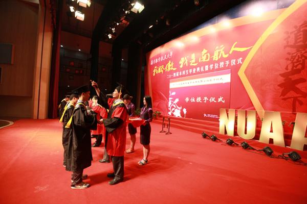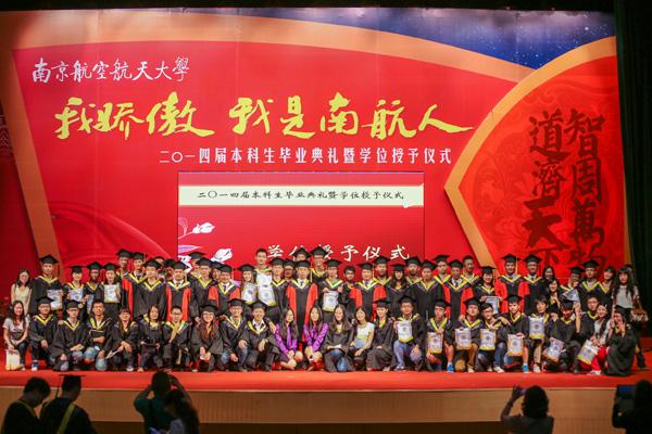 正式典礼在雄壮的国歌声中开始。首先,2014届毕业生代表张帆同学代表全体毕业生对母校四年来的关怀表达了真挚谢意。回首四年走过的日日夜夜,都已变成美好的回忆篆刻在每个人的心中。与所有2014届毕业生一起共勉:“效法羲和驭天马,志在长空牧群星”,并祝福南航、祝福学院:人才辈出!桃李芬芳!