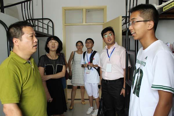 上午,院党委书记王勤前往新生报到点视察,了解了新生宿舍入住情况,并且深入宿舍与各专业新生进行了交流。下午四点,大雨忽至,我院院长姜斌和党委副书记沈伯秀冒雨来到我院迎新摊点视察。迎新工作人员向他们介绍了迎新工作流程和我院的特色活动。姜院长和沈书记均关注了年级微信公众平台,对我院别出心裁的迎新工作表示赞扬。随后,姜院长和沈书记参加了家长见面会,和新生家长们亲切交流。