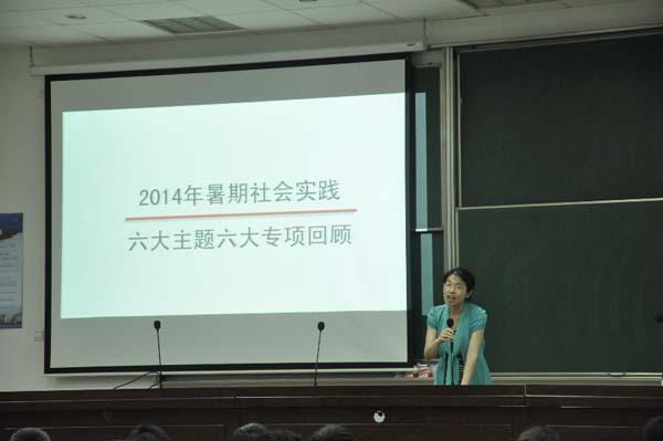 接下来,季老师带领大家回顾了2014年社会实践的六大主题以及六大专项,她阐述了社会实践的基本流程,即“实践选题,组建团队,开展实践,总结评比”,同时也解决了同学们“实践活动一般具体以何方式开展”“开展社会实践需要注意什么”等疑惑。她就生态环保、故乡之旅、专业实践、公益圆梦、梦想启航、社会调研六个板块的实践内容重点介绍了全校有代表性的团队,并共享了校园吉尼斯、个人成就奖、精彩图片等单项奖的优秀案例。她寄语同学们暑期社会实践需要怀揣热情,不怕苦不怕累,更需要充分准备与全情投入。