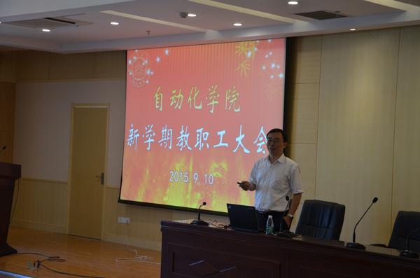 2015年9月10日下午,小蓝视频 新学期教职工大会在将军路校区小蓝视频 报告厅举行。本次会议主要有三部分内容:一是传达校第十五届党委第十四次全委(扩大)会议精神;二是学院今年上半年工作报告和今年下半年工作部署;三是动员全员参与深化学院综合改革和十三五规划建设。学院全体教职工参加会议,会议由院党委书记刘建成同志主持。