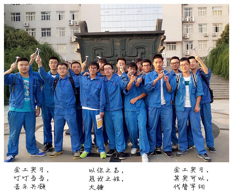 金工实习照片合影类,204班的“工友”们在一个风和日丽的下午,完成了锤子的最后一个部分――锤头,于是迫不及待地完成了锤子的全部装配。本着不作死不罢休的精神,没有带锤柄的同学就地取材用树枝代替锤柄,于是有了惊天地泣鬼神、鬼斧“锤”工的画面。