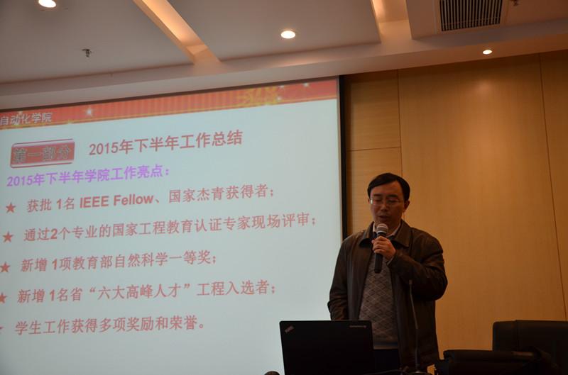 院长姜斌代表学院做工作报告,总结小蓝视频 2015年下半年工作,阐述2016年工作思路并做出工作部署。报告对学院的党建、教学、国际交流、科研、人事、学科建设、学生工作等方面做了全面总结和回顾。姜斌指出,按照学校党委部署,围绕学校中心工作,学院在学生培养、科研工作建设、学院文化建设等方面取得了新的突破和发展,获批 1名 IEEE Fellow、国家杰青获得者;通过2个专业的国家工程教育认证专家现场评审;新增 1项教育部自然科学一等奖;新增 1名省“六大高峰人才”工程入选者;学生工作获得多项奖励和荣誉。
