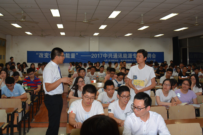随后,中兴通讯能源研究院电源研发部长刘彬以“改变世界的能量”为主题为同学们介绍了能源行业的技术现状,能源互联网涉及的技术以及中兴通讯能源研究院招聘岗位的情况。来自中兴通讯的三位南航校友们则分别通过他们各自在中兴通讯工作的经历与同学们分享了职业生涯规划与发展的经验,并且和在座的同学们展开了有趣的互动,现场氛围热烈。有多位同学在互动问答环节中获得了中兴手机、蓝牙蘑菇音箱等奖品。宣讲会结束后,很多同学都向HR递上了自己的简历。