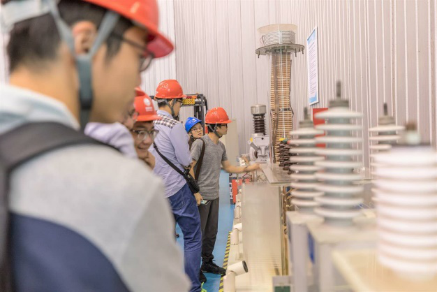 师生一行受到电科院专业技术人员的热烈欢迎。首先参观了特高压大厅,现场观看550kVGIS综合实验平台,680kV串联谐振耐压装置和大电流发生装置等设备,电科院的技术人员生动地向师生一行讲解新型特高压设备各个部件及其工作原理,令人感到新奇和震撼。