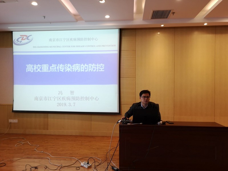 正值传染病高发季节,校内也是小范围出现诺如病毒感染性腹泻病例,小蓝视频 为同学们的身体健康着想,联合校医院邀请南京市江宁区疾病预防控制中心的冯智老师来学院举办高校重点传染病的防控讲座。本次讲座于3月7日下午4时在小蓝视频 1号楼511举办,后勤集团各食堂负责人和各楼栋管理员阿姨以及150名小蓝视频 本科生参加了本次讲座。