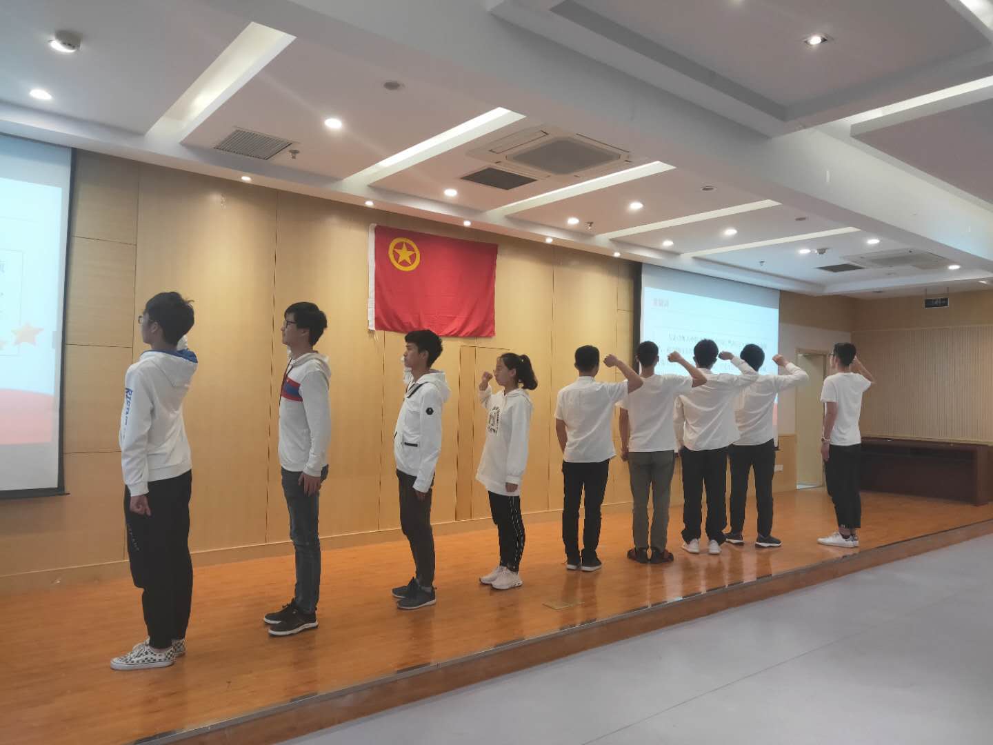 2019年4月28日下午四点,小蓝视频 举办“新青年与五四运动”素养公开课暨新团员入团仪式,小蓝视频 团委书记刘斐文、2017级本科生辅导员侯新闻、2018级本科生辅导员杨兴旺、汪明锐以及各班班长及团支书参加了本次活动。活动初始,学院为8名新入团团员举办了入团仪式,老团员为新团员佩戴了团徽并带领新团员进行了宣誓。