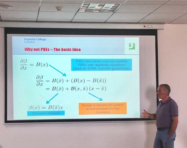 Alessandro Astolfi教授首先对偏微分方程(PDEs)的起源与发展做了简要介绍,阐述了偏微分方程在控制领域中的应用,同时指出了PDEs在实际应用中产生的一些问题。随后,他提出了一种新的不采用偏微分方程的方法来实现非线性控制,并以非线性观测器为例介绍了该方法的基本思路。接着,Alessandro Astolfi教授结合多智能体运动的协同问题,深入浅出的介绍了他们团队在该领域的最新研究成果,并展示了仿真效果。最后,Alessandro Astolfi教授对非线性控制的未来研究方向提出了展望。