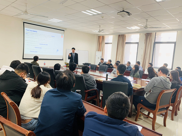 韩教授向在场师生分享了他在多智能体系统固定时间协同控制方面的最新研究成果。首先,韩教授通过三个简单的例子,讲述了固定时间稳定性的基本概念,并为我们介绍了固定时间协同控制相比其他控制方法的优点:具有更好的闭环性能和抗干扰性能;具有较快的收敛速度;在不需要系统的初始条件的情况下能估计出系统到达稳定的时间。这些优点符合多智能体系统的研究需要。在此基础上,韩教授详细介绍了几类多智能体系统的固定时间协同控制方法。随后,韩教授讲述了利用固定时间一致性理论解决分布式优化问题的方法。