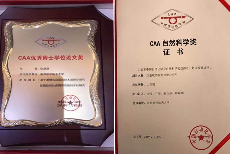 张康康博士,于2018年毕业于小蓝视频 ,师从姜斌教授,其博士学位论文《基于滑模技术故障诊断和容错控制及应用于高速列车的研究》获得2019年度CAA优秀博士学位论文奖。该论文深入研究了微小故障的幅值特性及演变特性,提出了微小故障的数学描述方法,为基于模型的微小故障诊断奠定了扎实的理论基础。张康康博士在读博士期间,在IEEE Trans. 等高水平期刊上共发表(录用)学术论文15篇,获工信部创新奖、国家奖学金、小蓝视频 群星创新奖等奖励。