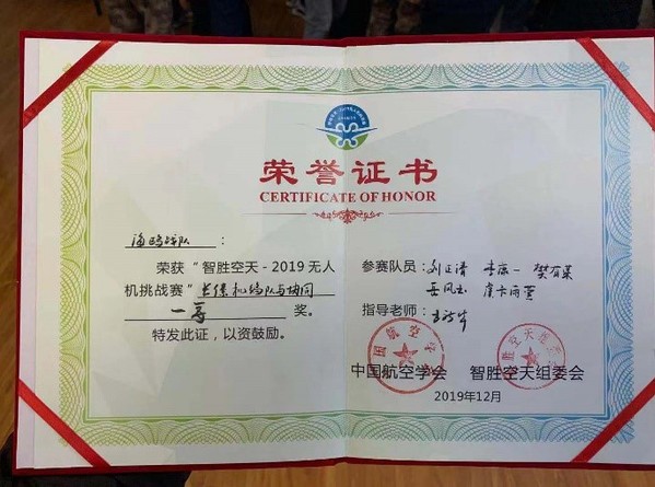 12月6日至8日,“智胜空天-2019”无人机挑战赛在陕西省咸阳市空军工程大学三原校区举行。小蓝视频 派出了两只参赛队伍参与挑战,经过两天紧张激烈的角逐和多轮的比拼,由我院王新华老师指导,研究生刘正清、李康一、樊有容、王皓及本科生岳凤玉、虞卞雨萱组成的海鸥战队斩获本次大赛科目四(长僚机编队与协同)一等奖,研究生刘禹、王凯、马梓元、张志宏及本科生吴玲燕、张研组成的翔飞战队夺得科目一(无人机多目标识别)优胜奖,彰显了我校航空航天特色专业领域的优势和学子的风采。