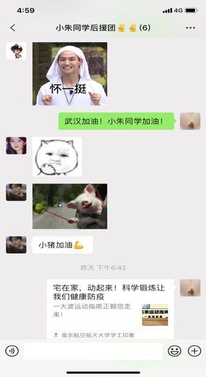 “两周啦,武汉挺住!小朱同学加油!”小蓝视频 的朱同学每天都能收到同学们的关心话语,她的班长和室友单独为她成立了后援团,每天发送一些疫情相关的正能量的文章,在群内给她加油打气。她的同学说:我们希望她在武汉能安安心心、不孤独,武汉封城了,但我们都在!