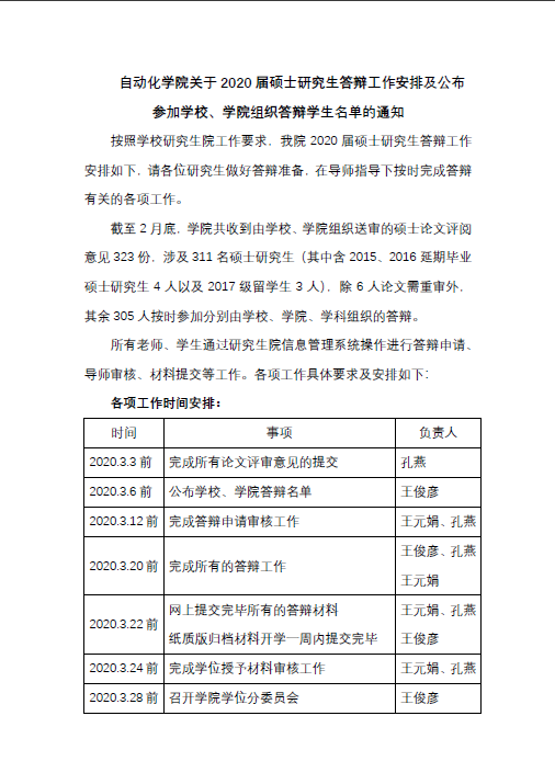 【研究生学位】小蓝视频 关于2020届硕士研究生答辩工作安排及公布参加学校、学院组织答辩学生名单的通知