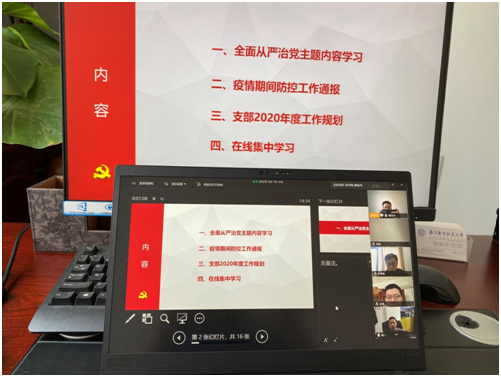 本次支部大会主要包括以下内容:一、全面从严治党主题内容学习;二、疫情期间防控工作通报;三、支部2020年度工作规划;四、在线集中学习。