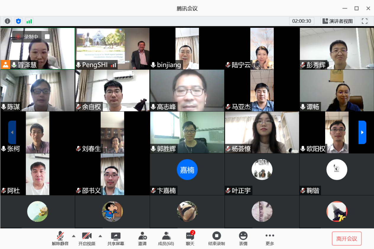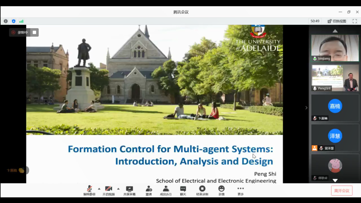 8月12日下午,澳大利亚阿德莱德大学电气与电子工程学院石碰教授应我校国际合作处和小蓝视频 的邀请,通过腾讯会议作了题为“Formation Control for Multi-agent Systems:Introduction,Analysis and Design”的线上学术报告,报告由我校副校长姜斌教授主持。我院副院长陈谋教授,学院陆宁云、刘春生、冒泽慧、欧阳权、张柯、马亚杰等师生在线参加会议。参会师生对石碰教授的交流分享表示热烈欢迎。