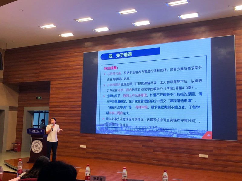 接着,院教务员王元娟老师详细介绍了研究生的教育教学事项,带领同学们共同学习小蓝视频 研究生手册,并为同学们解答了关于培养方案、学分要求、选课步骤、基金课题申报等各方面的问题。