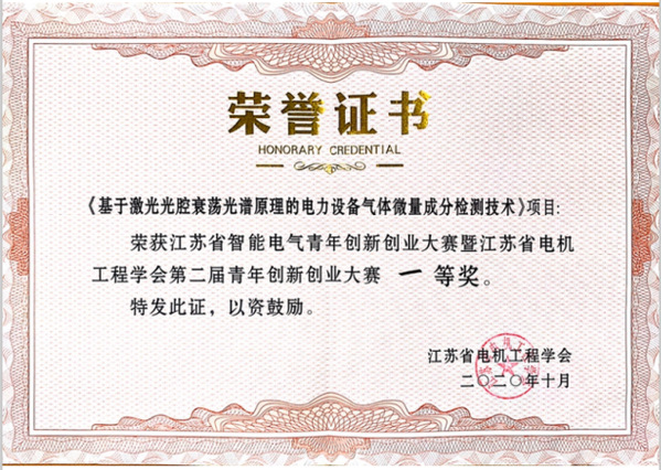 10月28日,江苏省智能电气暨江苏省电机工程学会第二届青年创新创业大赛在江苏扬中落下帷幕。本次大赛以“智能电气创赢未来”为主题,受到了江苏省内高校、电力科研、设计、生产、运维和制造等单位的积极响应。经过初赛、复赛的层层角逐,39个项目进入决赛答辩。我院张潮海教授指导的硕士研究生邹可园参赛项目“基于激光衰荡光谱原理的电力设备气体微量成分检测技术”荣获大赛一等奖。