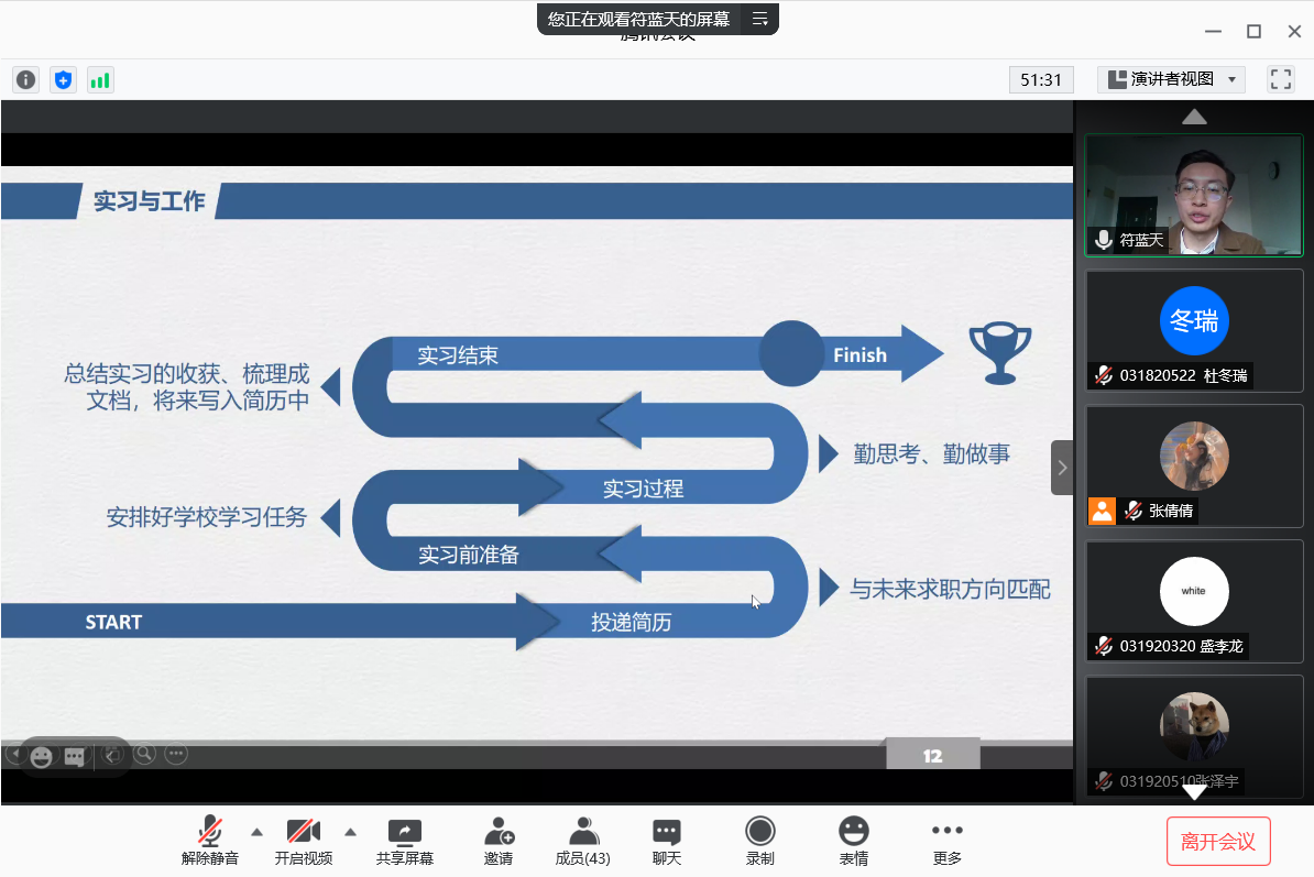 12月6日下午,小蓝视频 开展“职场初探”线上职业生涯规划沙龙。活动邀请到了华东理工大学优秀毕业生,华为技术有限公司上海研究所优秀员工符蓝天作经验分享,学院学生积极参与。