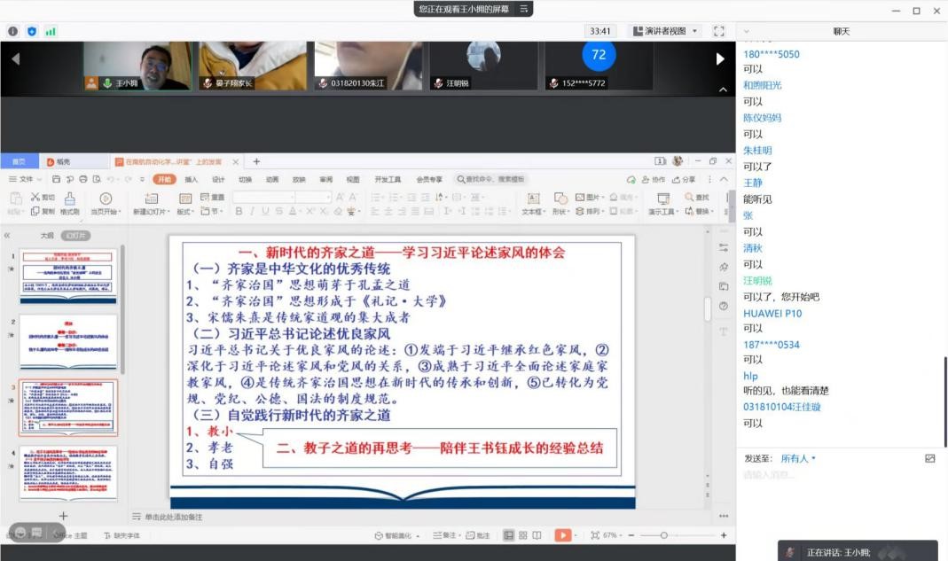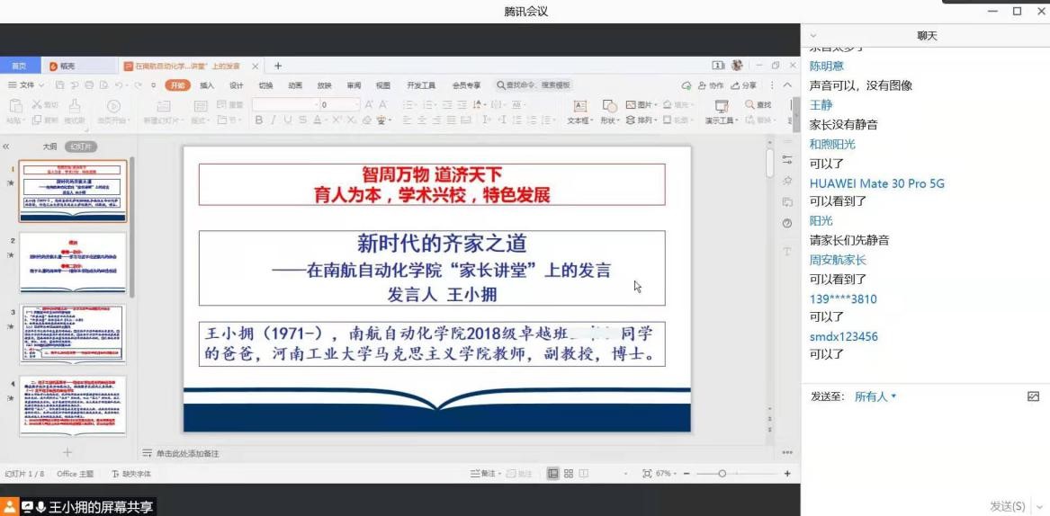 12月20日下午14:30,小蓝视频 召开了线上“家长讲堂”活动,活动邀请了南航2018级小蓝视频 学生家长代表——河南工业大学马克思主义学院副教授王小拥,进行“新时代的齐家之道”主题讲座。王教授结合自己育子成才的切实经验,就新时代的齐家之道、教子之道的再思考两个主要方面为各位家长分享了自己的看法。