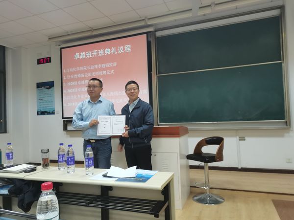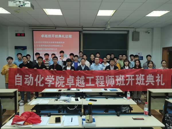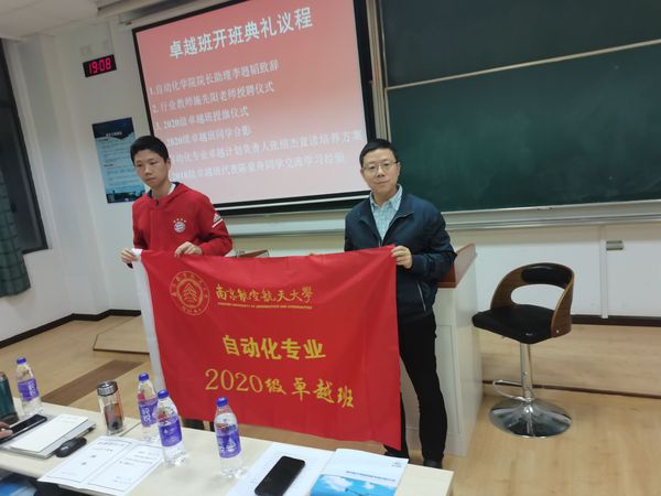 然后,李韪韬为南京航天国器智能装备有限公司战略总监施先阳老师颁发行业教师聘书,并为2020级卓越班授予班旗,与2020级卓越班同学和老师合影。