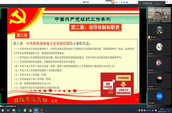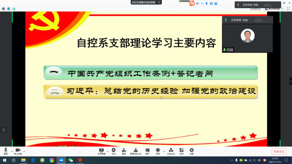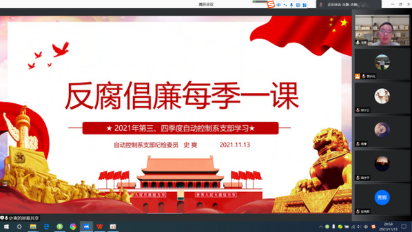 1113日,自动控制系党支部成功开展线上主题党日活动。鉴于近期国内多地相继出现新冠肺炎本土确诊病例,支部委员会做了周密安排和准备,在落实好常态化疫情防控措施的前提下以腾讯会议形式开展了内容丰富的主题党日活动,并邀请到校党委委员、副校长姜斌同志参会指导,支部党员参与度达到95%