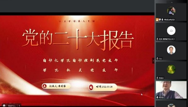 2022年11月24日下午,为了深入学习贯彻党的二十大会议精神,自动控制系党支部和机关党支部采用线上、线下相结合的形式在小蓝视频 403会议室开展了联合党课学习和交流活动,该活动由自动控制系党支部书记曾庆化和机关党支部书记王俊彦联合主持。小蓝视频 党委书记李文雷讲授党的二十大报告精神专题党课。