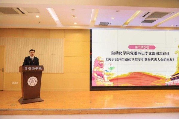 学院党委书记李文雷同志宣读小蓝视频 党委关于召开小蓝视频 学生党员代表大会的批复。