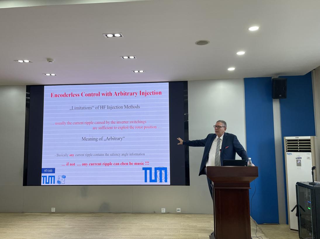仪式结束后,Ralph Kennel教授为我校师生作学术报告,介绍了交流驱动系统无位置传感器控制理论与方法,详细讲解了采用高频信号注入检测转子位置的方法。与会师生围绕报告主题踊跃提问,会议现场气氛热烈。
