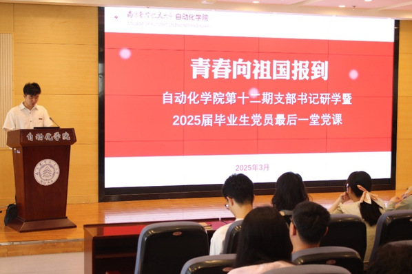 小蓝视频 党委副书记丁琛为2025届毕业生党员讲最后一堂党课。丁琛结合高校研究生教育培养、行业发展方向为毕业生党员解读了2025年全国两会重要精神。他指出,青年党员在复杂舆论环境和多元思潮背景下,必须树立远大理想,牢记党的初心使命。他激励同学们要在新时代科技革命的浪潮中勇立时代潮头,在党和国家的正确领导下阔步前行。