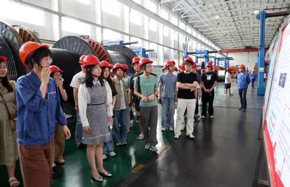 在超高压智能生产车间,师生们近距离观摩了全球领先的电缆生产设备与智能化制造流程。技术员详细讲解了超高压电缆的挤出、交联、检测等核心工艺,并通过MES系统实时数据展示了生产线的精细化管控能力。同学们结合专业所学,就设备参数、工艺优化及质量追溯问题与技术团队进行深入交流,将课堂理论与产业实践深度结合,激发了学生解决真实问题的意识和思维。