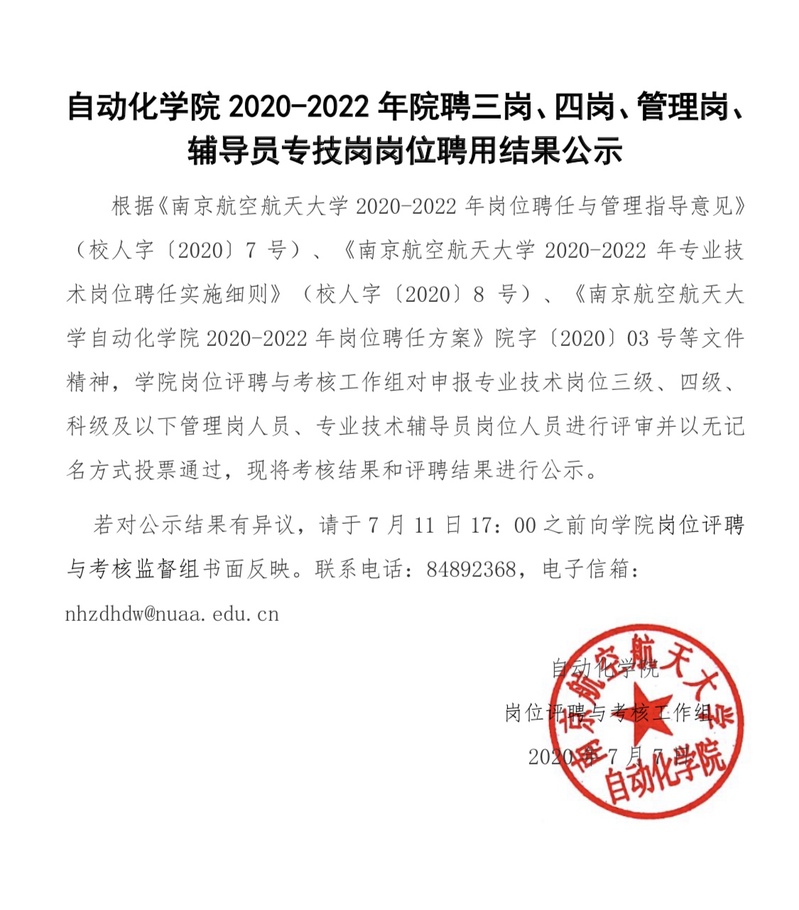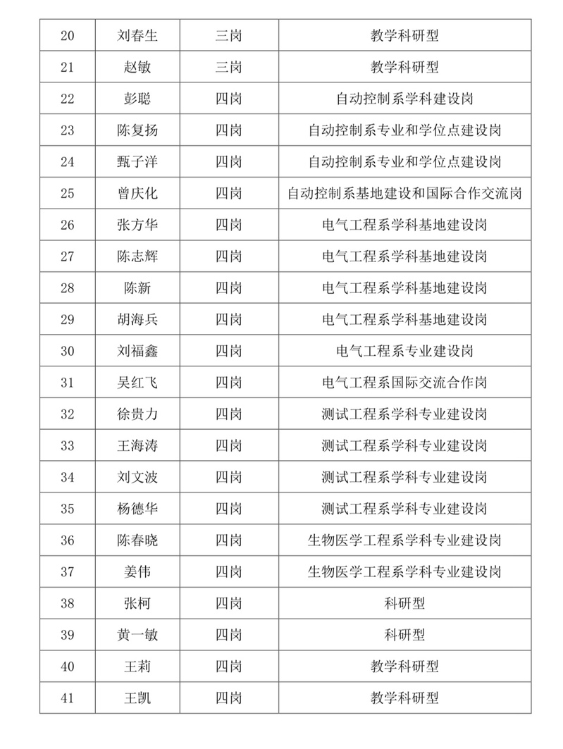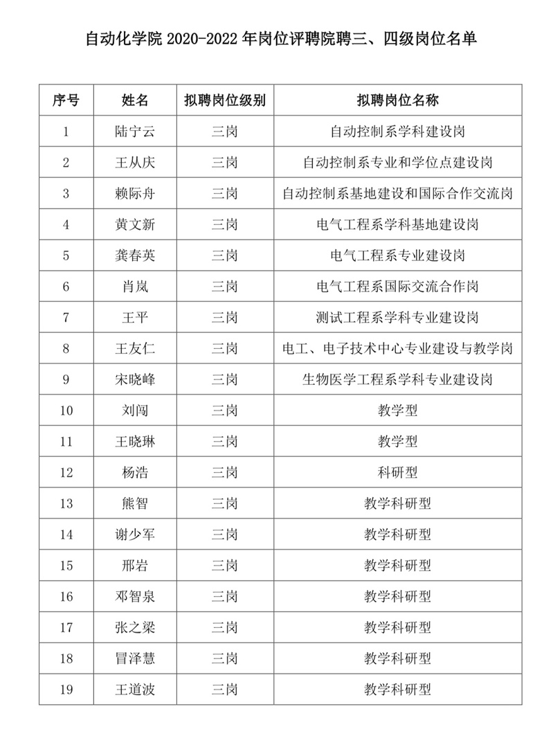 自动化学院2020-2022年院聘三岗、四岗、管理岗、辅导员专技岗岗位聘用结果公示