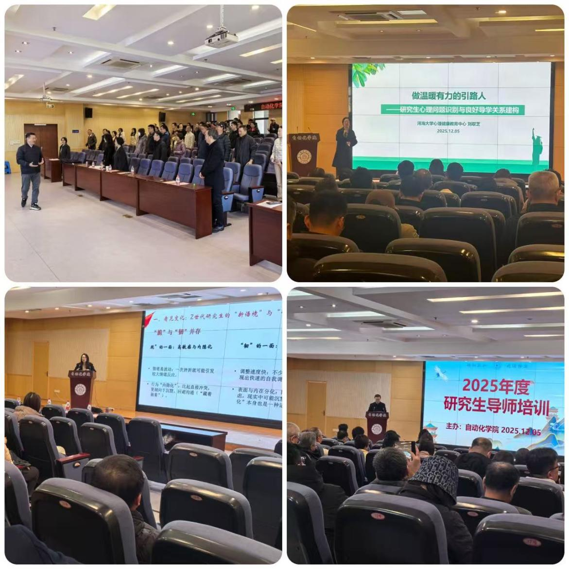 12月5日下午,自动化学院2025年度(下半年)研究生导师培训会在511报告厅召开。本次培训会聚焦师生身心健康与导学关系提升,特邀艺术学院院长板俊荣教授、河海大学学生处副处长刘取芝教授和学院党委副书记阙愚作专题报告,学院研究生导师和教学办老师共计100余人参加培训。培训会由学院副院长宋晓峰主持。